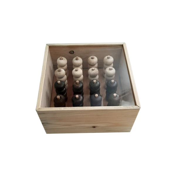 قطعات ایـن محصول تماما از جـنـس چوب ساخته شده است و ۳۲ مهره سفید و ۳۲ مهره قهوه ای به همراه پایه چوبی-میله ای مخصوص را شامل میشود .