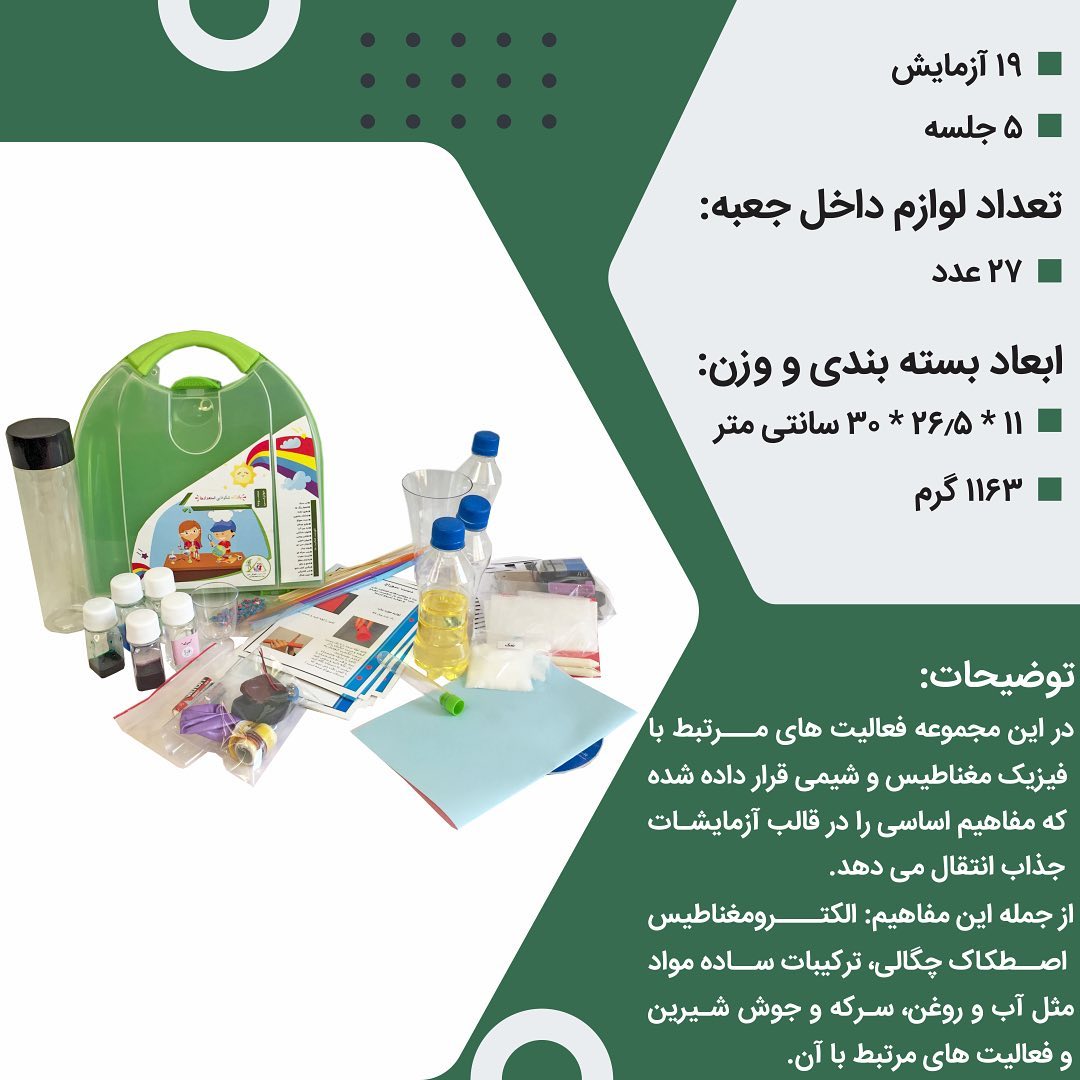 در این مجموعه فعالیت های مرتبط با فیزیک مغاطیس و شیمی قرار داده شده که مفاهیم اساسی را در قالب آزمایشات جذاب انتقال می دهد. از جمله این مفاهیم الکترومغناطیس اصطکاک چگالی،ترکیبات ساده موادمثل آب و روغن،سرکه و جوش شیرین و فعالیت های مرتبط با آن است